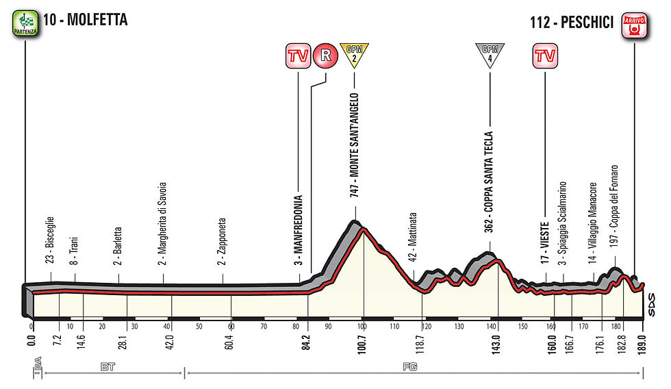 189 quilómetros ligam Molfetta a Peschici ma 8ª etapa do Giro. Esta tirada pode ser dividida em duas partes completamente distintas. Os primeiros 84.2 quilómetros são planos e só depois começam as dificuldades. Existe, logo, uma segunda categoria Monte Sant Angelo (9.6 kms a 6.1%. Após uma longa descida, existe uma fase de sobe e desce que culmina com a Coppa Santa Tecla (7.6 kms a 4.2%), quando estiverem percorridos 143 kms.